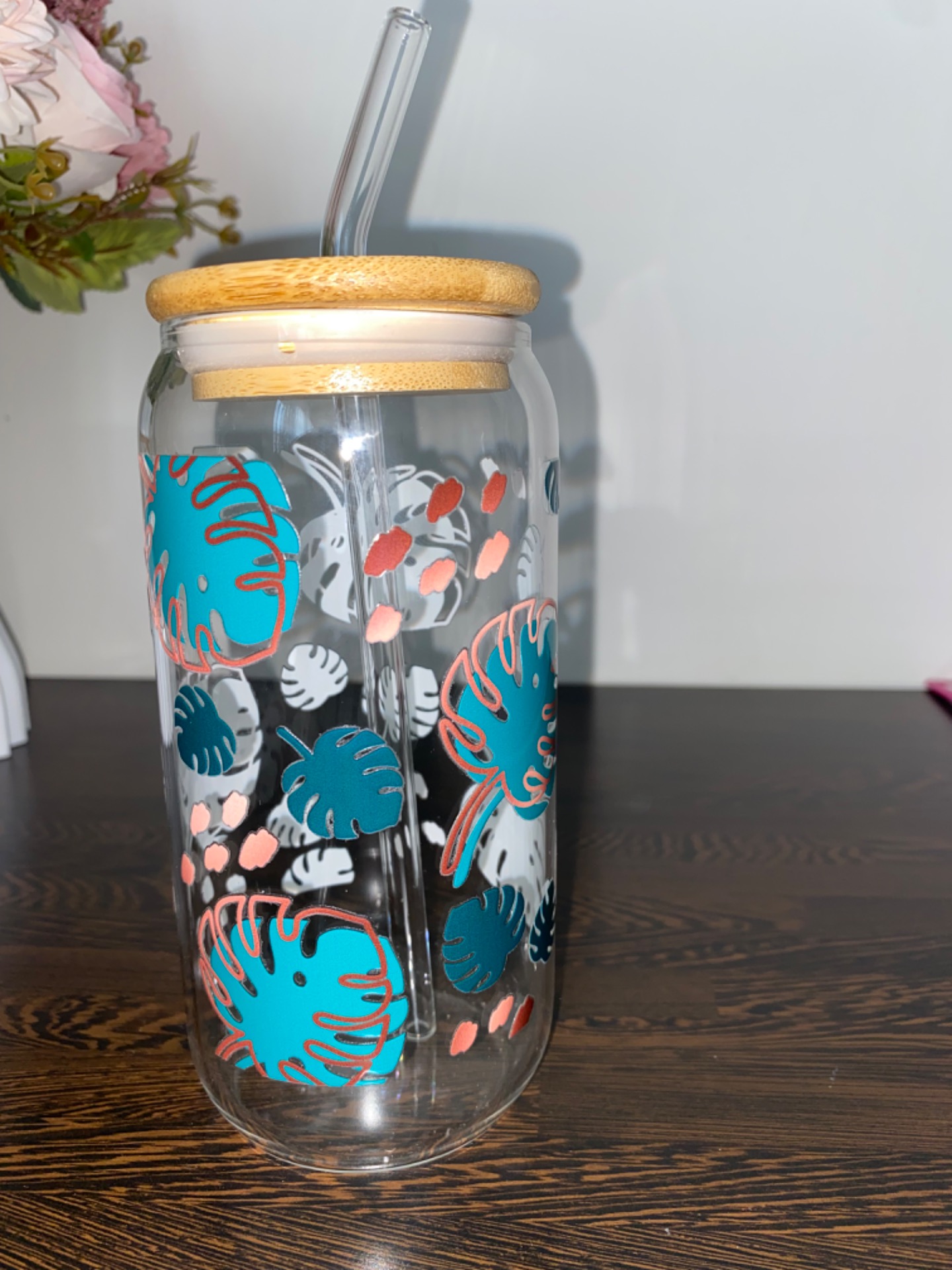 Součástí balení bambusové víčko a skleněné brčko