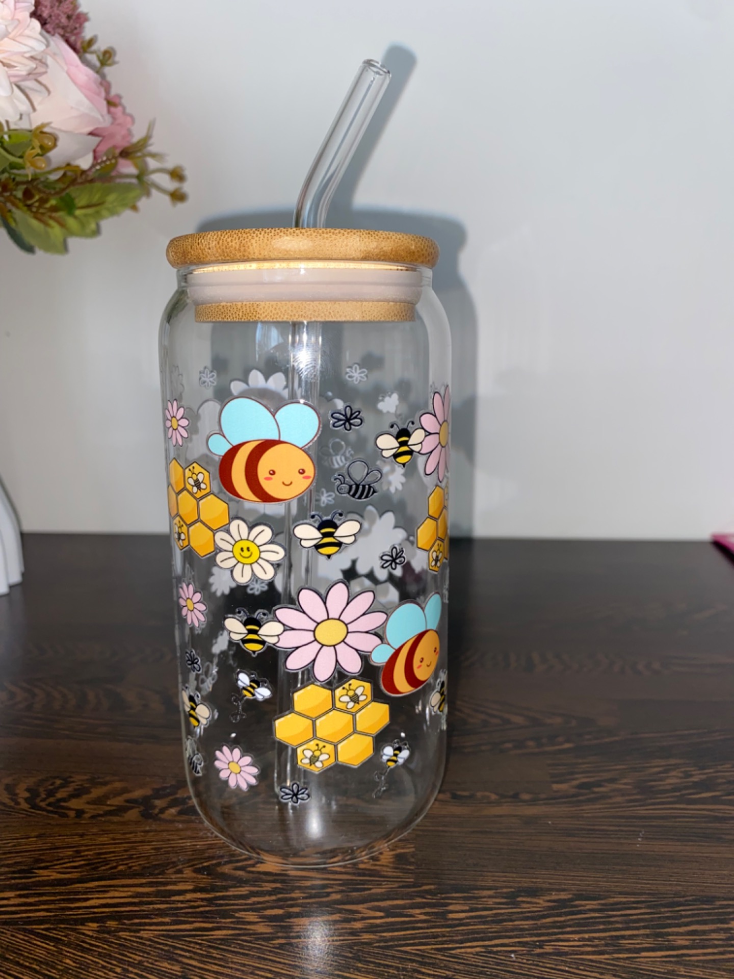 Součástí balení bambusové víčko a skleněné brčko