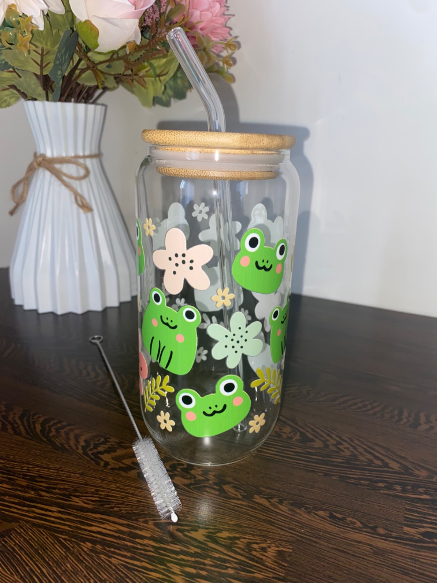 Součástí balení bambusové víčko a skleněné brčko